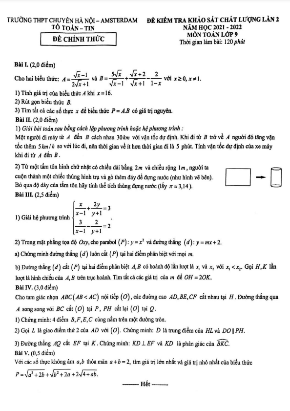 Đề khảo sát lần 2 Toán 9 năm 2021 – 2022 trường chuyên Hà Nội – Amsterdam