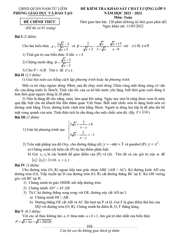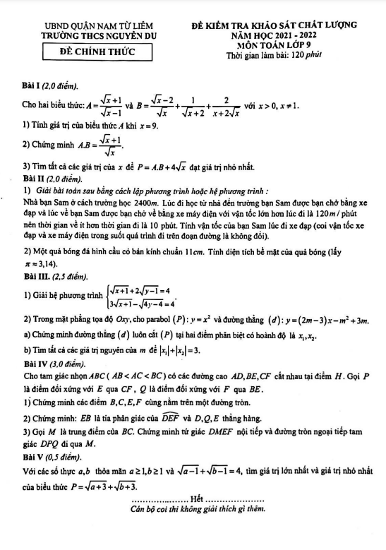 Đề khảo sát Toán 9 năm 2021 – 2022 phòng GD&ĐT Nam Từ Liêm – Hà Nội