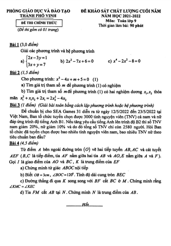 Đề KSCL Toán 9 cuối năm 2021 – 2022 phòng GD&ĐT thành phố Vinh – Nghệ An