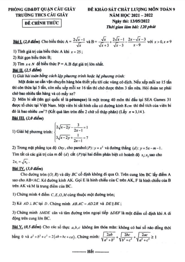 Đề KSCL Toán 9 năm 2021 – 2022 trường THCS Cầu Giấy – Hà Nội