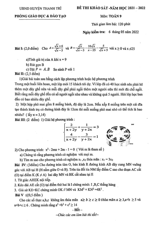 Đề thi khảo sát Toán 9 năm 2021 – 2022 phòng GD&ĐT Thanh Trì – Hà Nội