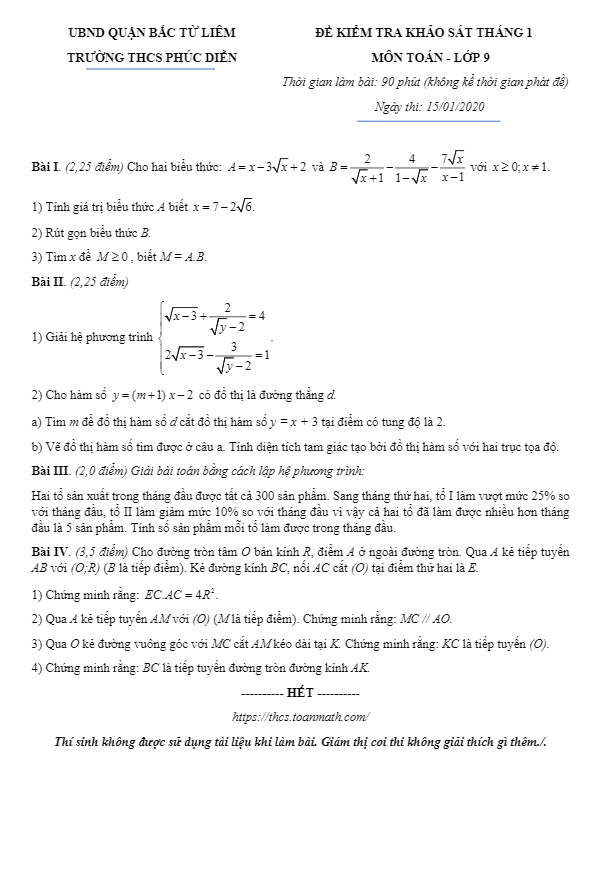 Đề khảo sát Toán 9 tháng 1 năm 2020 trường THCS Phúc Diễn – Hà Nội
