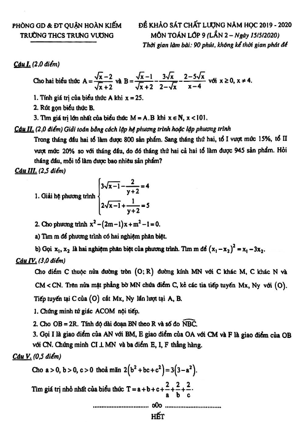 Đề khảo sát Toán 9 lần 2 năm 2019 – 2020 trường THCS Trưng Vương – Hà Nội