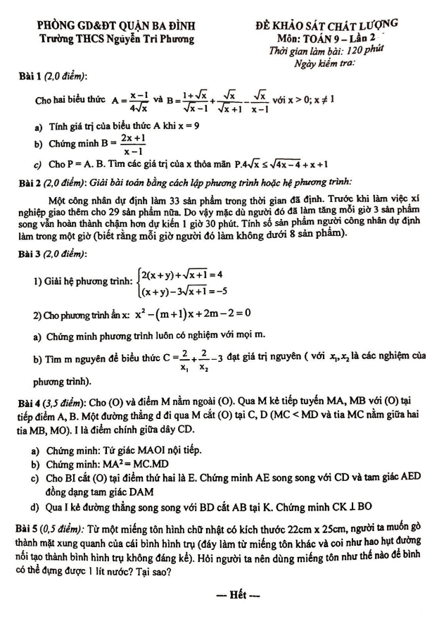 Đề khảo sát chất lượng Toán 9 lần 2 trường THCS Nguyễn Tri Phương – Hà Nội