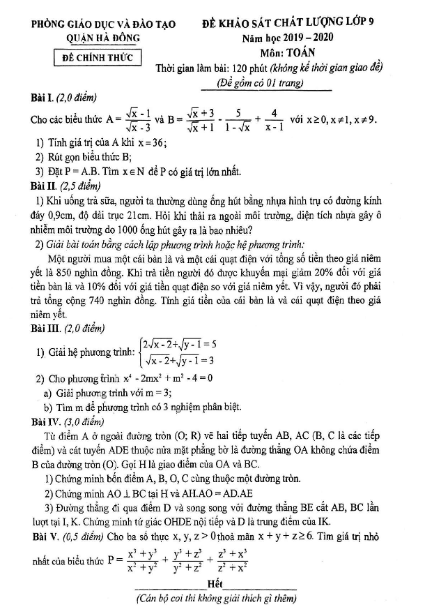 Đề khảo sát chất lượng Toán 9 năm 2019 – 2020 phòng GD&ĐT Hà Đông – Hà Nội