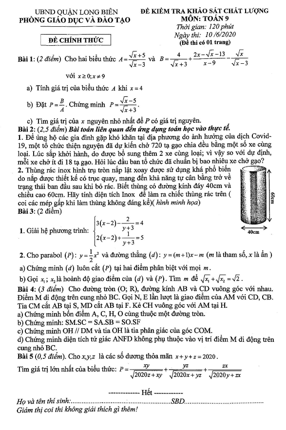 Đề khảo sát chất lượng Toán 9 năm 2019 – 2020 phòng GD&ĐT Long Biên – Hà Nội