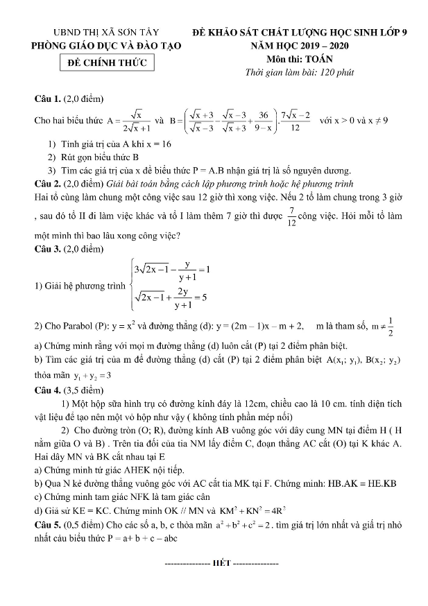 Đề khảo sát chất lượng Toán 9 năm 2019 – 2020 phòng GD&ĐT Sơn Tây – Hà Nội