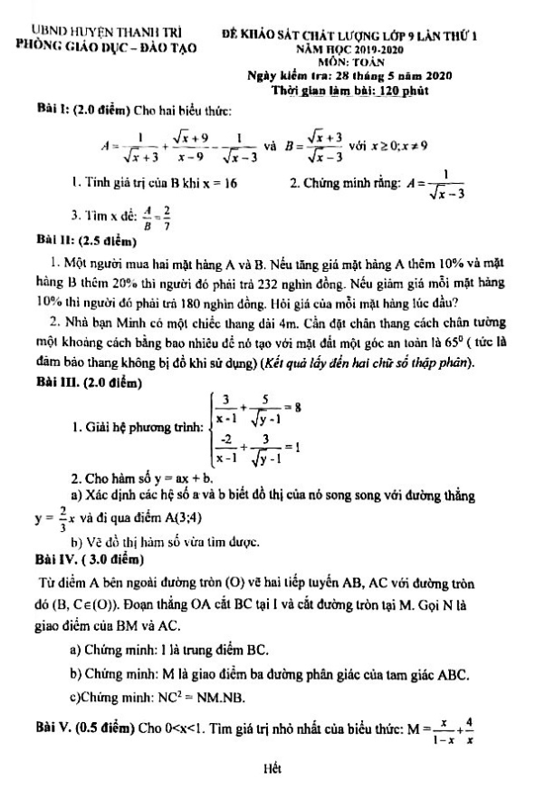 Đề khảo sát Toán 9 lần 1 năm 2019 – 2020 phòng GD&ĐT Thanh Trì – Hà Nội