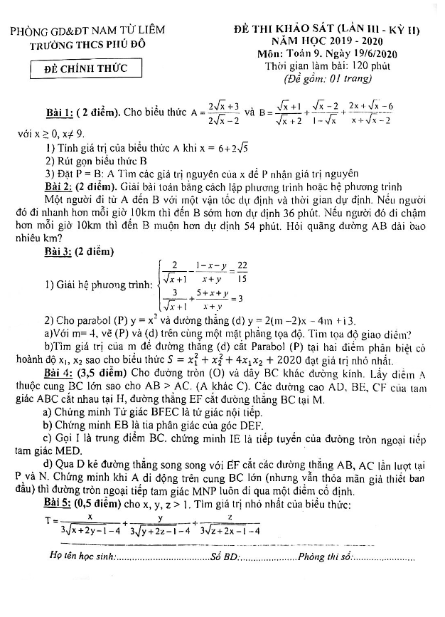 Đề khảo sát Toán 9 lần 3 kỳ 2 năm 2019 – 2020 trường THCS Phú Đô – Hà Nội