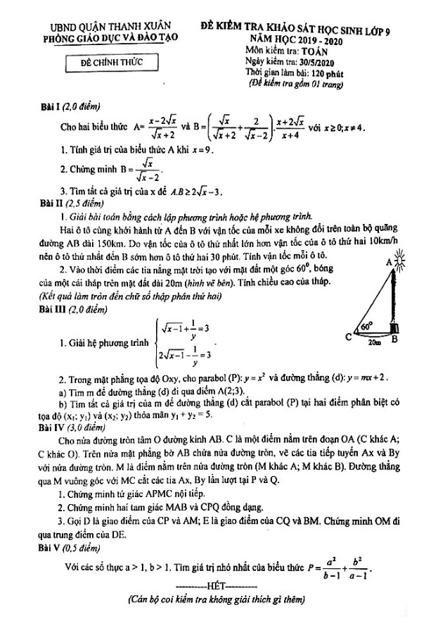 Đề khảo sát Toán 9 năm 2019 – 2020 phòng GD&ĐT Thanh Xuân – Hà Nội