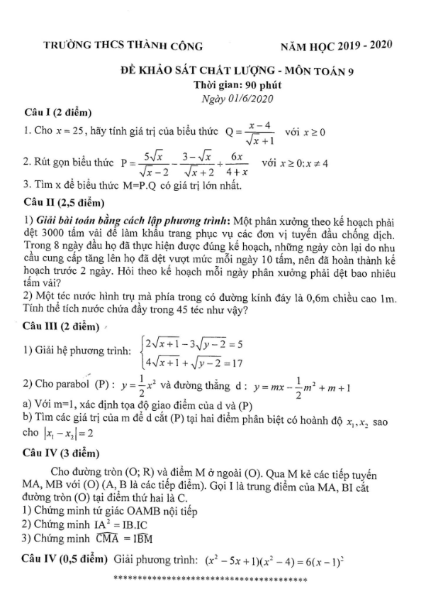Đề khảo sát Toán 9 năm học 2019 – 2020 trường THCS Thành Công – Hà Nội