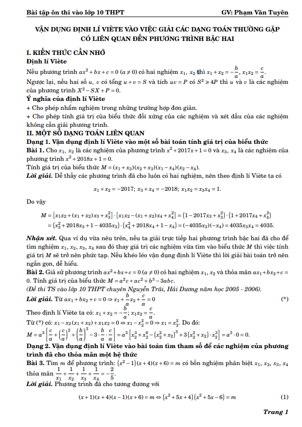 Vận dụng định lí Viète giải các dạng toán liên quan đến phương trình bậc hai