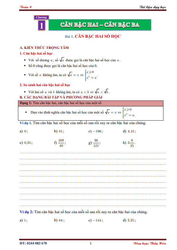 Lý thuyết và bài tập môn Toán 9 học kì 1 – Đỗ Văn Đạt