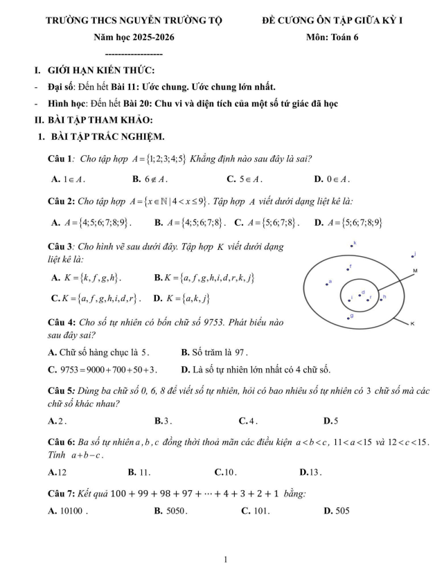 Đề Cương Ôn Tập Toán 6 Đề cương giữa kỳ 1 Toán 6 năm 2025 – 2026 trường THCS Nguyễn Trường Tộ – Hà Nội 10/10/2025