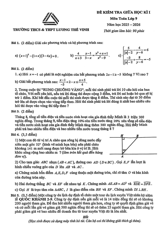 Đề Thi Giữa HK1 Toán 9 Đề giữa học kì 1 Toán 9 năm 2025 – 2026 trường Lương Thế Vinh – Hà Nội 14/10/2025