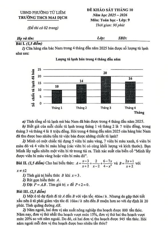 Khảo Sát Chất Lượng Toán 9 Đề khảo sát Toán 9 tháng 10 năm 2025 trường THCS Mai Dịch – Hà Nội 13/10/2025