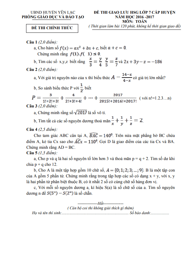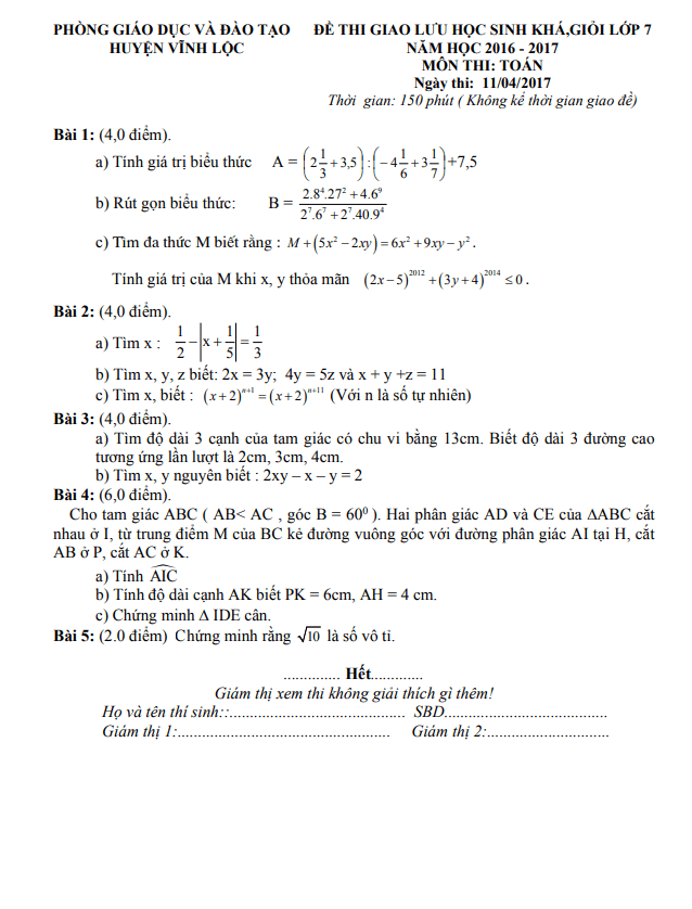 Đề Thi HSG Toán 7 Đề giao lưu HSG Toán 7 năm 2016 – 2017 phòng GD&ĐT Tam Dương – Vĩnh Phúc 01/03/2017